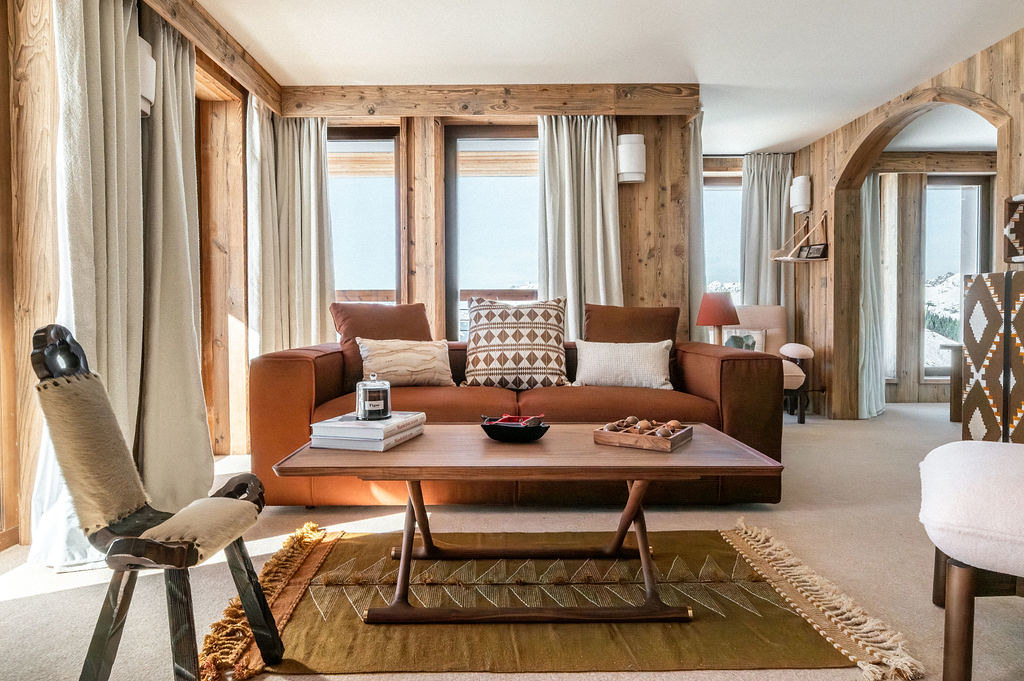 Suspendu à 1 850 m d’altitude, accessible uniquement par télécabine, Le Refuge Chez La Tante – Mont d’Arbois est une adresse rare, à mi-chemin entre le refuge de montagne et l’hôtel confidentiel. À l’intérieur, bois massif, tissus naturels, objets chinés et lumière douce composent un décor chaleureux où l’on se sent immédiatement « chez soi ». Les 20 chambres et la suite penthouse se déploient comme des cocons, offrant une vue imprenable sur les sommets et une atmosphère enveloppante, propice à la déconnexion.